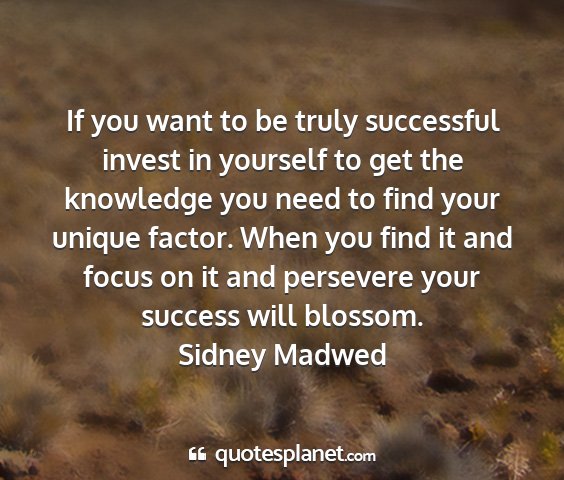 If you want to be truly successful invest in yourself to get the knowledge you need to find your unique factor. When you find it and focus on it and persevere your success will blossom.Sidney Madwed