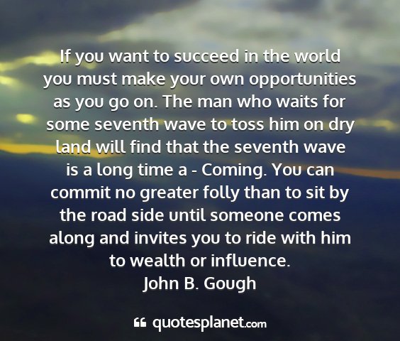 If you want to succeed in the world you must make your own opportunities as you go on. The man who waits for some seventh wave to toss him on dry land will find that the seventh wave is a long time a - Coming. You can commit no greater folly than to sit by the road side until someone comes along and invites you to ride with him to wealth or influence.John B. Gough