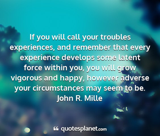 If you will call your troubles experiences, and remember that every experience develops some latent force within you, you will grow vigorous and happy, however adverse your circumstances may seem to be.John R. Mille