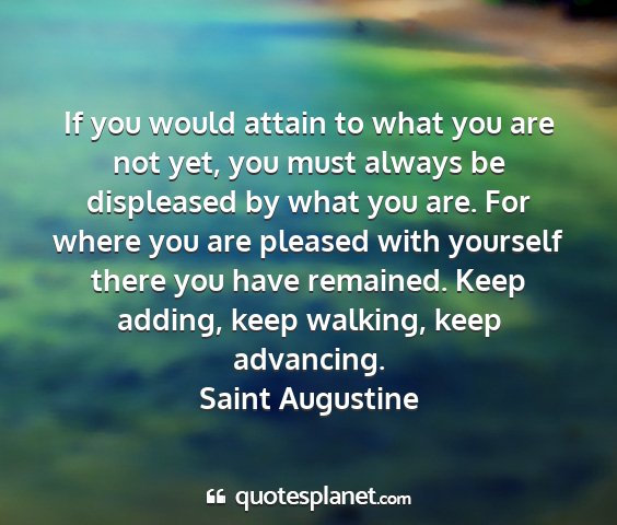 If you would attain to what you are not yet, you must always be displeased by what you are. For where you are pleased with yourself there you have remained. Keep adding, keep walking, keep advancing.Saint Augustine