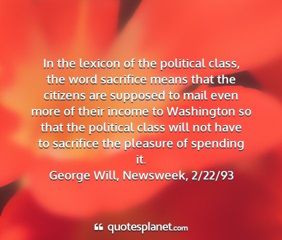 In the lexicon of the political class, the word sacrifice means that the citizens are supposed to mail even more of their income to Washington so that the political class will not have to sacrifice the pleasure of spending it.George Will, Newsweek, 2/22/93