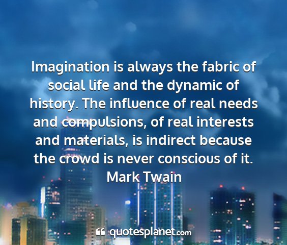 Imagination is always the fabric of social life and the dynamic of history. The influence of real needs and compulsions, of real interests and materials, is indirect because the crowd is never conscious of it.Mark Twain