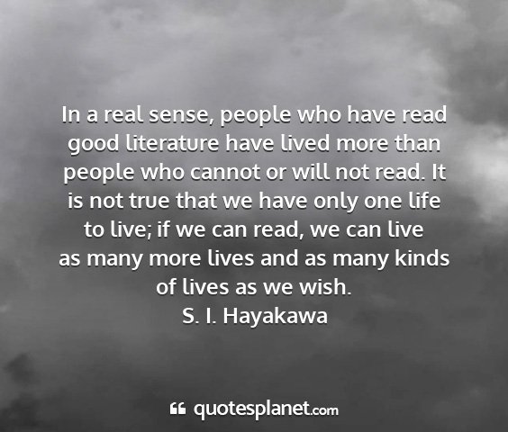 In a real sense, people who have read good literature have lived more than people who cannot or will not read. It is not true that we have only one life to live; if we can read, we can live as many more lives and as many kinds of lives as we wish.S. I. Hayakawa