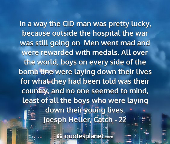 In a way the CID man was pretty lucky, because outside the hospital the war was still going on. Men went mad and were rewarded with medals. All over the world, boys on every side of the bomb line were laying down their lives for what they had been told was their country, and no one seemed to mind, least of all the boys who were laying down their young lives.Joesph Heller, Catch - 22