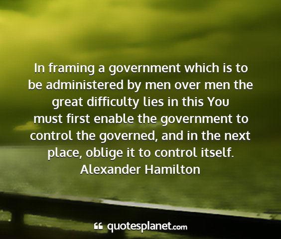 In framing a government which is to be administered by men over men the great difficulty lies in this You must first enable the government to control the governed, and in the next place, oblige it to control itself.Alexander Hamilton