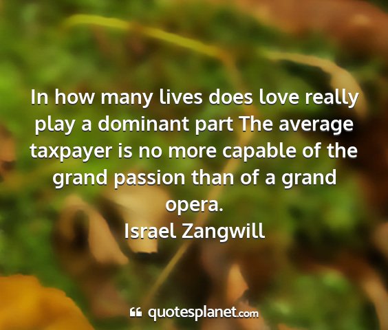 In how many lives does love really play a dominant part The average taxpayer is no more capable of the grand passion than of a grand opera.Israel Zangwill