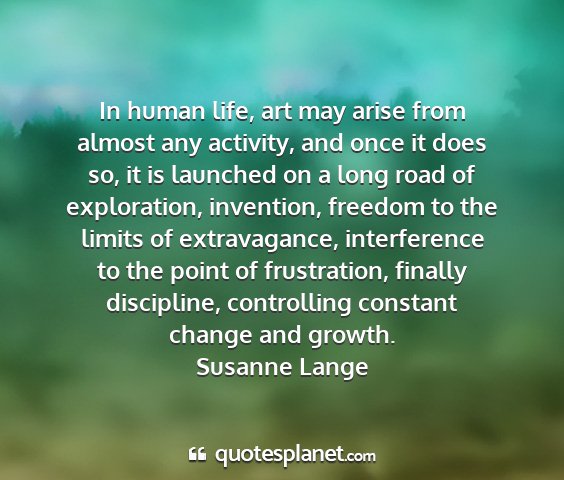 In human life, art may arise from almost any activity, and once it does so, it is launched on a long road of exploration, invention, freedom to the limits of extravagance, interference to the point of frustration, finally discipline, controlling constant change and growth.Susanne Lange