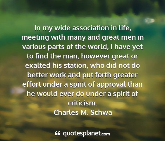 In my wide association in life, meeting with many and great men in various parts of the world, I have yet to find the man, however great or exalted his station, who did not do better work and put forth greater effort under a spirit of approval than he would ever do under a spirit of criticism.Charles M. Schwa