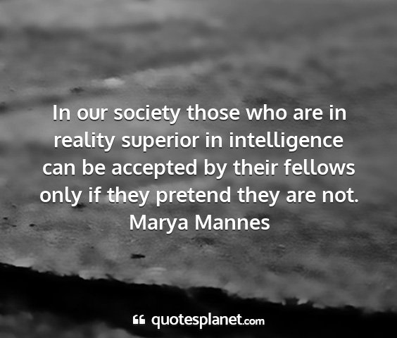 In our society those who are in reality superior in intelligence can be accepted by their fellows only if they pretend they are not.Marya Mannes