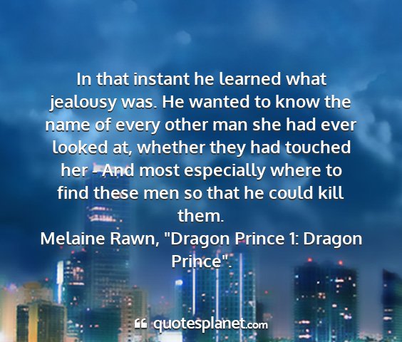 In that instant he learned what jealousy was. He wanted to know the name of every other man she had ever looked at, whether they had touched her - And most especially where to find these men so that he could kill them.Melaine Rawn, "Dragon Prince 1: Dragon Prince".