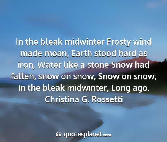 In the bleak midwinter Frosty wind made moan, Earth stood hard as iron, Water like a stone Snow had fallen, snow on snow, Snow on snow, In the bleak midwinter, Long ago.Christina G. Rossetti
