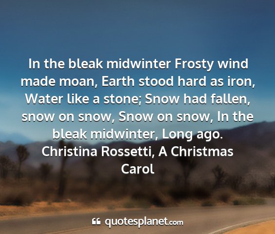 In the bleak midwinter Frosty wind made moan, Earth stood hard as iron, Water like a stone; Snow had fallen, snow on snow, Snow on snow, In the bleak midwinter, Long ago.Christina Rossetti, A Christmas Carol