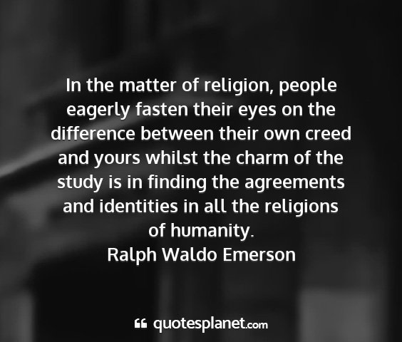 In the matter of religion, people eagerly fasten their eyes on the difference between their own creed and yours whilst the charm of the study is in finding the agreements and identities in all the religions of humanity.Ralph Waldo Emerson