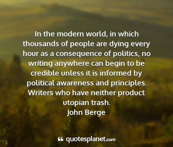 In the modern world, in which thousands of people are dying every hour as a consequence of politics, no writing anywhere can begin to be credible unless it is informed by political awareness and principles. Writers who have neither product utopian trash.John Berge