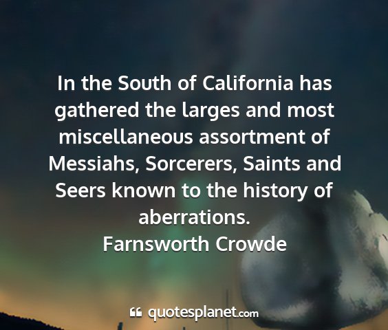 In the South of California has gathered the larges and most miscellaneous assortment of Messiahs, Sorcerers, Saints and Seers known to the history of aberrations.Farnsworth Crowde