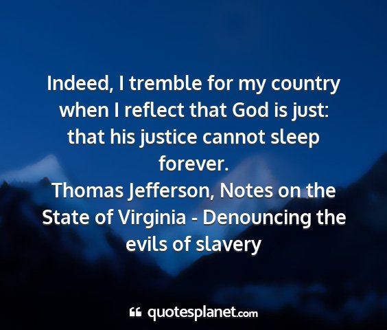 Indeed, I tremble for my country when I reflect that God is just: that his justice cannot sleep forever.Thomas Jefferson, Notes on the State of Virginia - Denouncing the evils of slavery