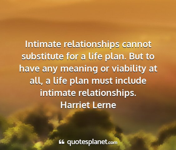 Intimate relationships cannot substitute for a life plan. But to have any meaning or viability at all, a life plan must include intimate relationships.Harriet Lerne