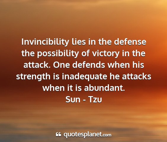 Invincibility lies in the defense the possibility of victory in the attack. One defends when his strength is inadequate he attacks when it is abundant.Sun - Tzu