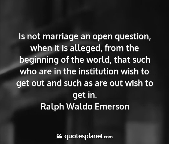Is not marriage an open question, when it is alleged, from the beginning of the world, that such who are in the institution wish to get out and such as are out wish to get in.Ralph Waldo Emerson