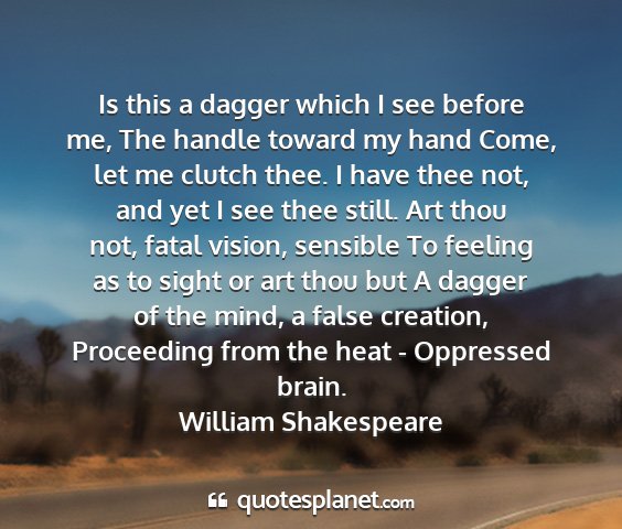 Is this a dagger which I see before me, The handle toward my hand Come, let me clutch thee. I have thee not, and yet I see thee still. Art thou not, fatal vision, sensible To feeling as to sight or art thou but A dagger of the mind, a false creation, Proceeding from the heat - Oppressed brain.William Shakespeare