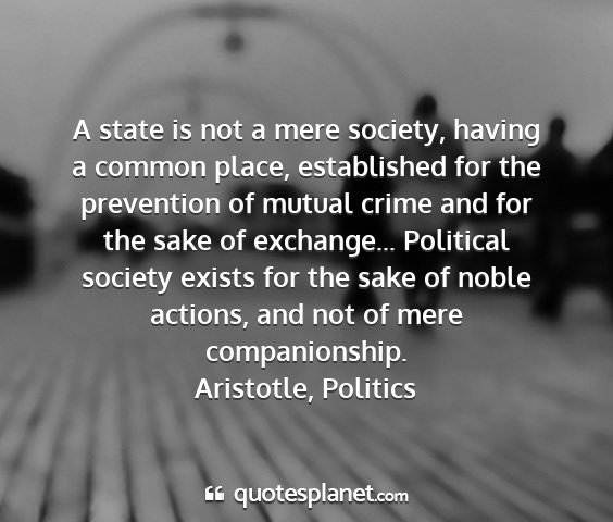 A state is not a mere society, having a common place, established for the prevention of mutual crime and for the sake of exchange... Political society exists for the sake of noble actions, and not of mere companionship.Aristotle, Politics