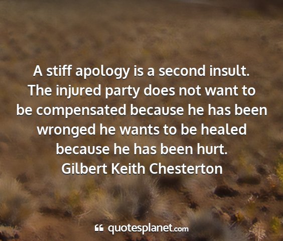 A stiff apology is a second insult. The injured party does not want to be compensated because he has been wronged he wants to be healed because he has been hurt.Gilbert Keith Chesterton
