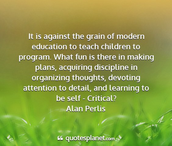It is against the grain of modern education to teach children to program. What fun is there in making plans, acquiring discipline in organizing thoughts, devoting attention to detail, and learning to be self - Critical?Alan Perlis