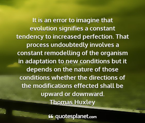 It is an error to imagine that evolution signifies a constant tendency to increased perfection. That process undoubtedly involves a constant remodelling of the organism in adaptation to new conditions but it depends on the nature of those conditions whether the directions of the modifications effected shall be upward or downward.Thomas Huxley