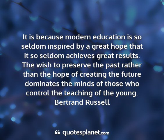It is because modern education is so seldom inspired by a great hope that it so seldom achieves great results. The wish to preserve the past rather than the hope of creating the future dominates the minds of those who control the teaching of the young.Bertrand Russell