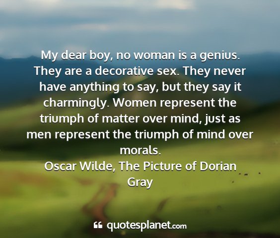 My dear boy, no woman is a genius. They are a decorative sex. They never have anything to say, but they say it charmingly. Women represent the triumph of matter over mind, just as men represent the triumph of mind over morals.Oscar Wilde, The Picture of Dorian Gray