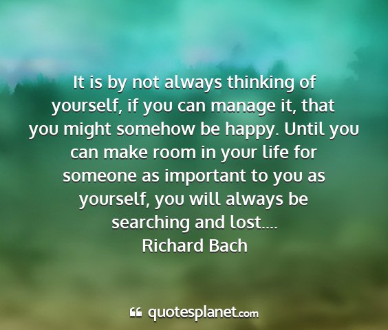 It is by not always thinking of yourself, if you can manage it, that you might somehow be happy. Until you can make room in your life for someone as important to you as yourself, you will always be searching and lost....Richard Bach