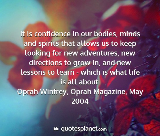 It is confidence in our bodies, minds and spirits that allows us to keep looking for new adventures, new directions to grow in, and new lessons to learn - which is what life is all about.Oprah Winfrey, Oprah Magazine, May 2004