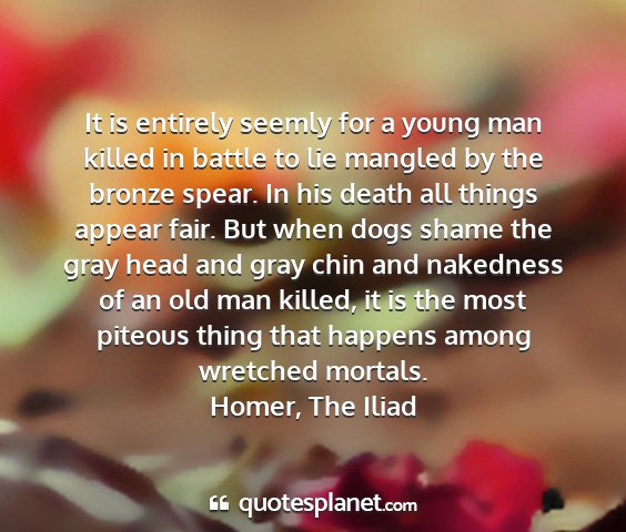 It is entirely seemly for a young man killed in battle to lie mangled by the bronze spear. In his death all things appear fair. But when dogs shame the gray head and gray chin and nakedness of an old man killed, it is the most piteous thing that happens among wretched mortals.Homer, The Iliad