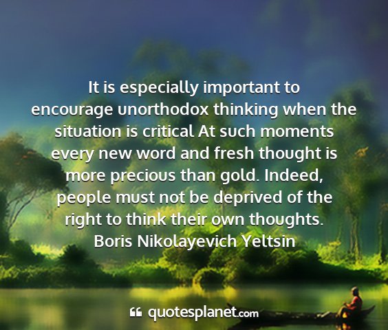 It is especially important to encourage unorthodox thinking when the situation is critical At such moments every new word and fresh thought is more precious than gold. Indeed, people must not be deprived of the right to think their own thoughts.Boris Nikolayevich Yeltsin