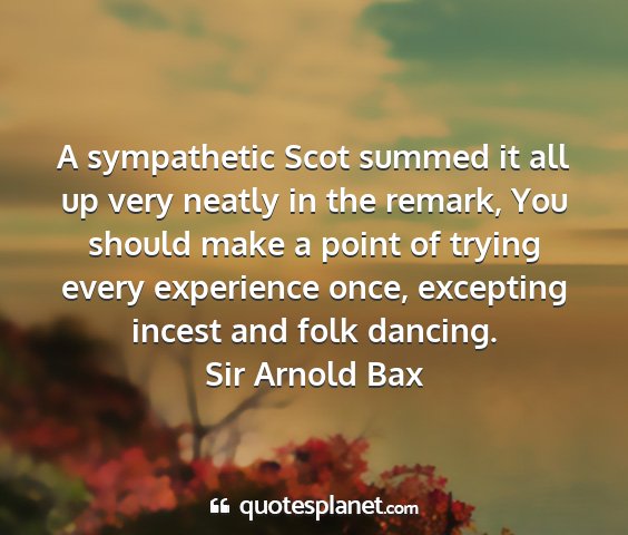 A sympathetic Scot summed it all up very neatly in the remark, You should make a point of trying every experience once, excepting incest and folk dancing.Sir Arnold Bax