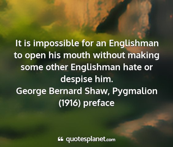 It is impossible for an Englishman to open his mouth without making some other Englishman hate or despise him.George Bernard Shaw, Pygmalion (1916) preface