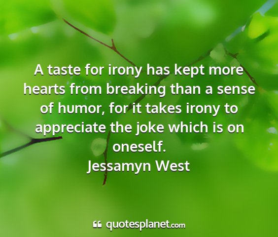 A taste for irony has kept more hearts from breaking than a sense of humor, for it takes irony to appreciate the joke which is on oneself.Jessamyn West