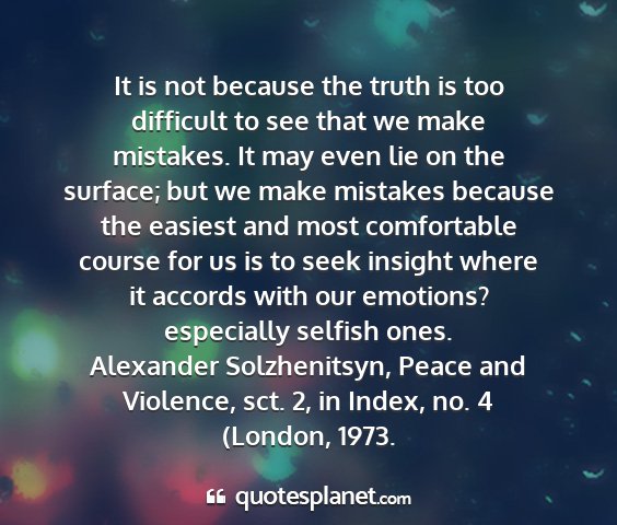It is not because the truth is too difficult to see that we make mistakes. It may even lie on the surface; but we make mistakes because the easiest and most comfortable course for us is to seek insight where it accords with our emotions? especially selfish ones.Alexander Solzhenitsyn, Peace and Violence, sct. 2, in Index, no. 4 (London, 1973.