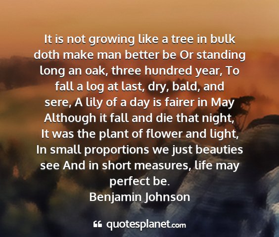 It is not growing like a tree in bulk doth make man better be Or standing long an oak, three hundred year, To fall a log at last, dry, bald, and sere, A lily of a day is fairer in May Although it fall and die that night, It was the plant of flower and light, In small proportions we just beauties see And in short measures, life may perfect be.Benjamin Johnson