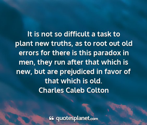 It is not so difficult a task to plant new truths, as to root out old errors for there is this paradox in men, they run after that which is new, but are prejudiced in favor of that which is old.Charles Caleb Colton