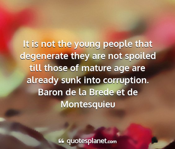 It is not the young people that degenerate they are not spoiled till those of mature age are already sunk into corruption.Baron de la Brede et de Montesquieu