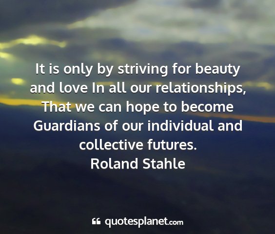 It is only by striving for beauty and love In all our relationships, That we can hope to become Guardians of our individual and collective futures.Roland Stahle