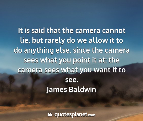 It is said that the camera cannot lie, but rarely do we allow it to do anything else, since the camera sees what you point it at: the camera sees what you want it to see.James Baldwin