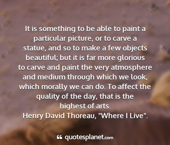 It is something to be able to paint a particular picture, or to carve a statue, and so to make a few objects beautiful; but it is far more glorious to carve and paint the very atmosphere and medium through which we look, which morally we can do. To affect the quality of the day, that is the highest of arts.Henry David Thoreau, "Where I Live".