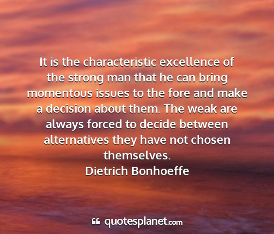 It is the characteristic excellence of the strong man that he can bring momentous issues to the fore and make a decision about them. The weak are always forced to decide between alternatives they have not chosen themselves.Dietrich Bonhoeffe