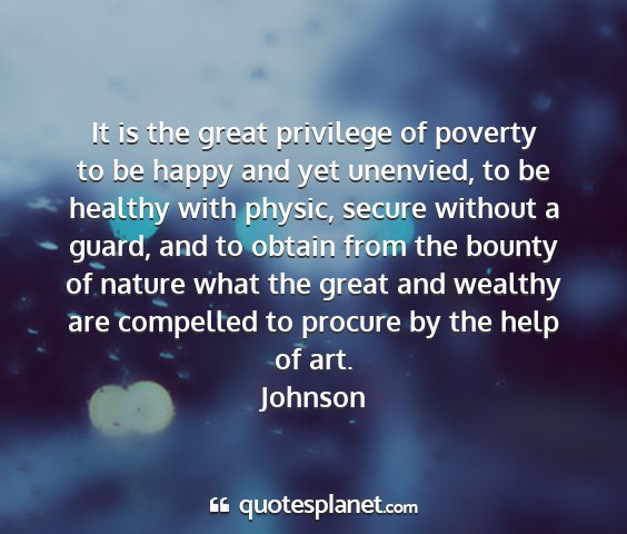It is the great privilege of poverty to be happy and yet unenvied, to be healthy with physic, secure without a guard, and to obtain from the bounty of nature what the great and wealthy are compelled to procure by the help of art.Johnson