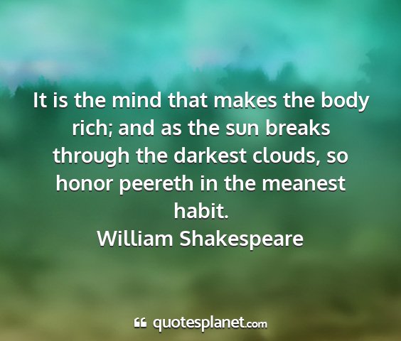 It is the mind that makes the body rich; and as the sun breaks through the darkest clouds, so honor peereth in the meanest habit.William Shakespeare