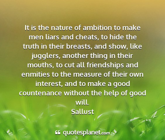 It is the nature of ambition to make men liars and cheats, to hide the truth in their breasts, and show, like jugglers, another thing in their mouths, to cut all friendships and enmities to the measure of their own interest, and to make a good countenance without the help of good will.Sallust