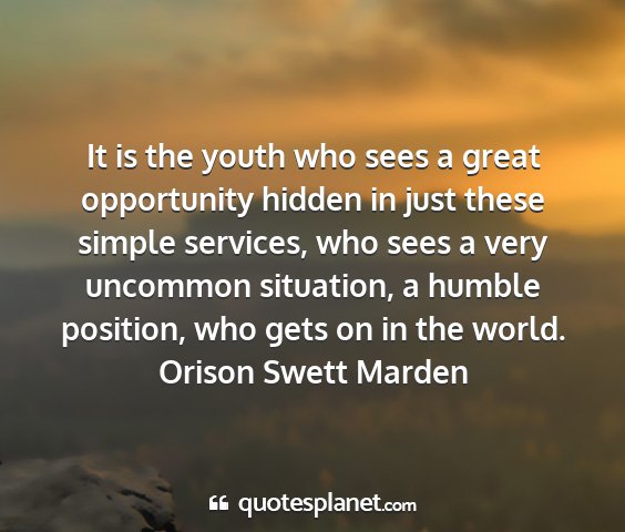 It is the youth who sees a great opportunity hidden in just these simple services, who sees a very uncommon situation, a humble position, who gets on in the world.Orison Swett Marden