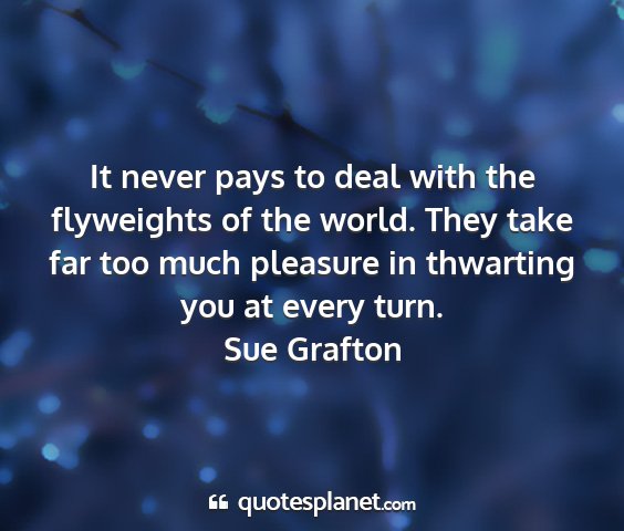 It never pays to deal with the flyweights of the world. They take far too much pleasure in thwarting you at every turn.Sue Grafton
